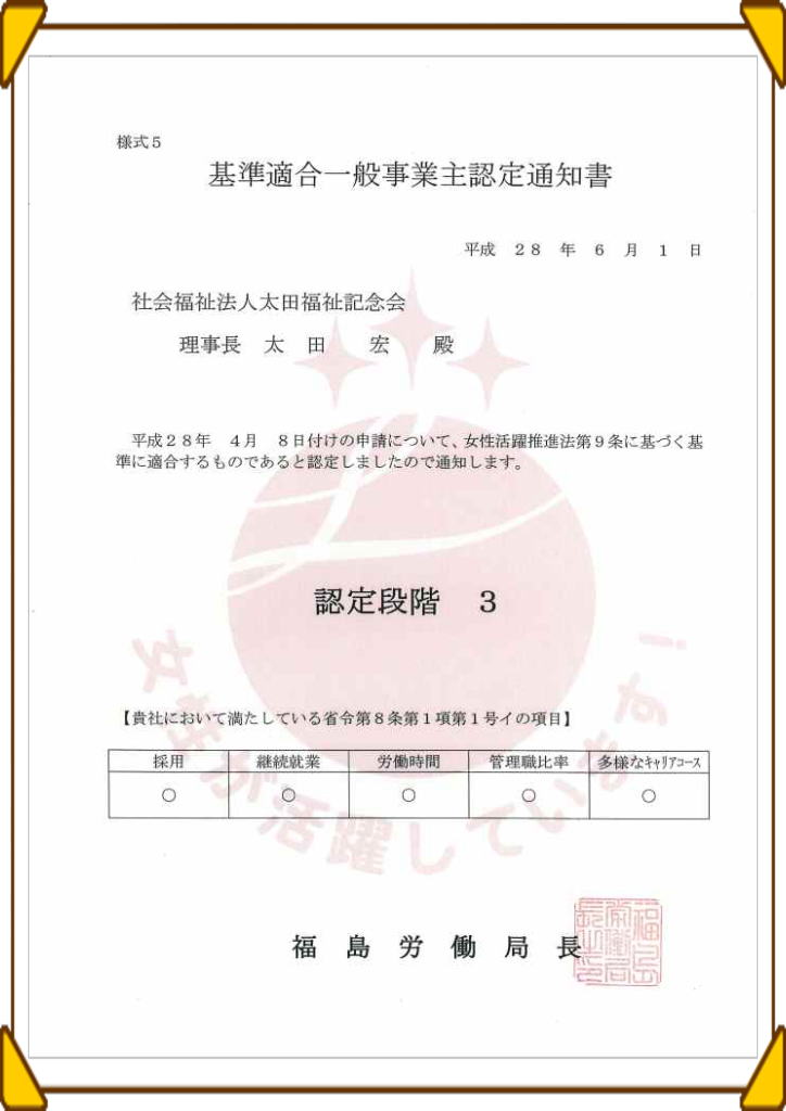 太田福祉記念会は、平成28年6月1日付で女性の活躍推進が優良な企業として厚生労働大臣認定を取得しました。5つの基準すべてを満たした最高位の認定で、従業員が300人以下の企業では東北初。全国でも3社目の認定で、今後は認定マーク「えるぼしマーク」の使用が許されます。
